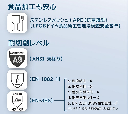 EN 388:(耐摩耗レベル4 耐切創レベルX 耐引裂レベル4 耐突刺レベルX EN ISO 13997 耐切創レベルF)